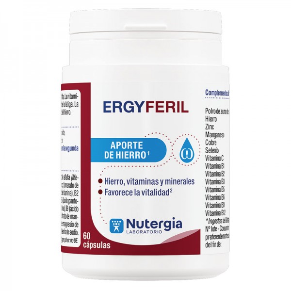 ERGYFeRIL es una asociación de 8 vitaminas, 4 minerales y 3 plantas con propiedades complementarias de gran interés en estados de carencia o deficiencia de hierro.