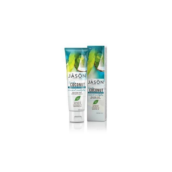 Dentífrico Refrescante Coco y Eucalipto de Jason, libre de fluoridos y 99% fuente escológico.