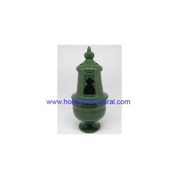 Incensario fabricado en barro esmaltado. Está dividido en dos partes. Su uso está indicado para el uso de carbón incandescente sobre el que se vierte una pequeña cantidad de incienso, alhucema, romero, etc.. o bien se pueden utilizar conos de incienso.