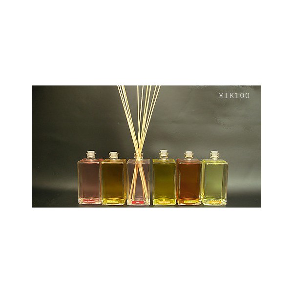 Conjunto de Mikado a base de frasco en vidrio alemán con 100 cc de Perfume + 8 palitos de ratan en diametro de 2,5 mm y 30 cms de largo.