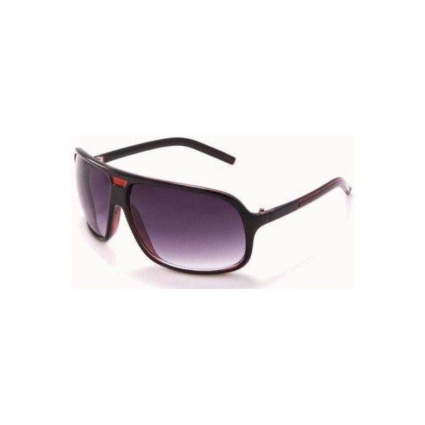 Montura de pasta de color negro con un detalle en rojo entre las lentes, varillas sencillas con líneas rojizas y lentes de color negro en dregadé.